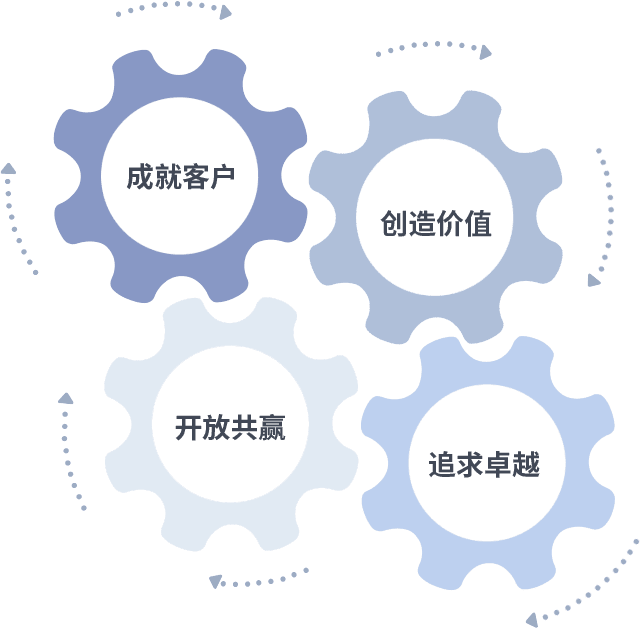 成就客户是一切决策的出发点,创造价值是衡量所有工作的标准,追求卓越是竞技联盟德州做事做人的态度,开放共赢是竞技联盟德州的格局也是最终的结果。价值观的齿轮环环相扣,推动着组织里的每个人不断向前。